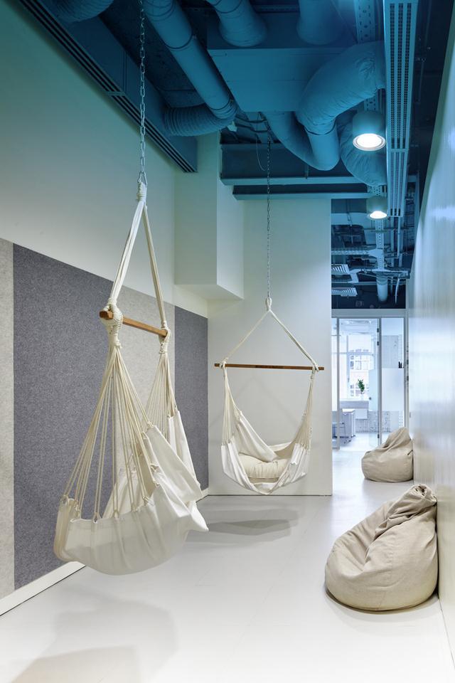 除了工作區,這里還設有幾處休閑咖啡區、一個設施完備的餐廚區,以及用高靠背沙發、吊床和懶人沙發配置的非正式交流區。