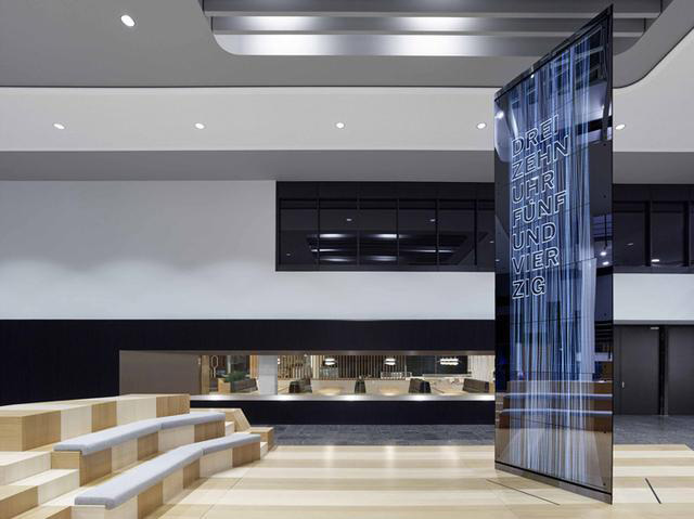 這座酷炫的玻璃裝置猶如鐘塔般顯示著日期時(shí)間,矗立在大廳中央。除了顯示時(shí)間,裝置還會(huì)感知進(jìn)出大廳的人員情況轉(zhuǎn)換顯示“知識(shí)”和“教育”等詞語,以及公司的當(dāng)?shù)氐膶?shí)時(shí)新聞。