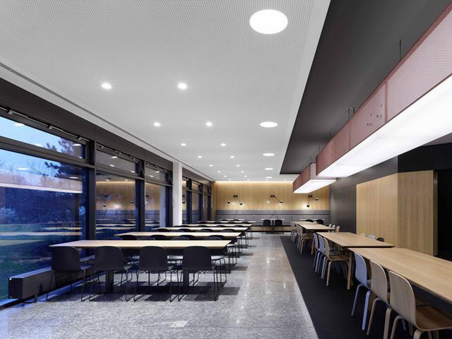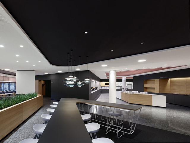 身處這座大廳,人們可以從多個(gè)視角觀察兩個(gè)樓層的大致功能:周邊是培訓(xùn)和管理區(qū)域、一處展示空間,一樓還能通向餐廳區(qū)域。培訓(xùn)中心的餐廳也重新改造,規(guī)劃為豐富多元的特色空間,提升了空間的應(yīng)用效率。