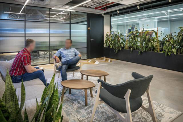 綠色是公司的標識色。設(shè)計將其巧妙地與空間元素相結(jié)合,強化了品牌印象。精心設(shè)計定制的辦公家具不僅帶來豐富的視覺效果,同時亦起到空間動線導(dǎo)向的作用。頂面錯落的方塊吊頂與地面形成呼應(yīng),星羅棋布的點狀吊燈帶來俏皮的的氛圍。