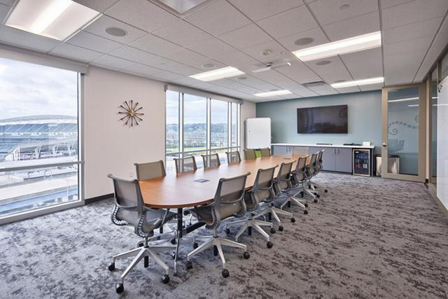 站在室內(nèi),肯塔基州北部河濱和丘陵的廣闊視野給了設(shè)計(jì)團(tuán)隊(duì)靈感,將最好的視野區(qū)作為公共核心區(qū)來規(guī)劃室內(nèi)布局。所選擇的材料、辦公家具等都是對(duì)周圍自然環(huán)境的詮釋。